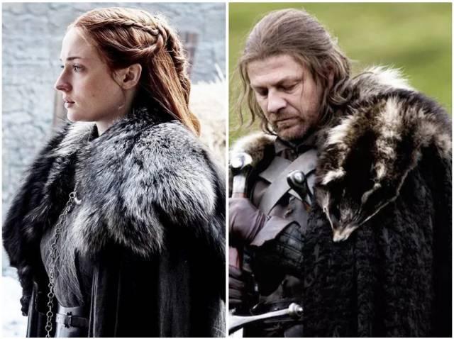 再将珊莎现在的造型和前几季中她父母的造型稍作对比,会发现她的野心远远超出一般人的想象。她让自己化身为Ned Stark和Catelyn Stark的完美结合体,看来是要以临冬城女主人的身份名正言顺地开启“挑事儿”模式。
